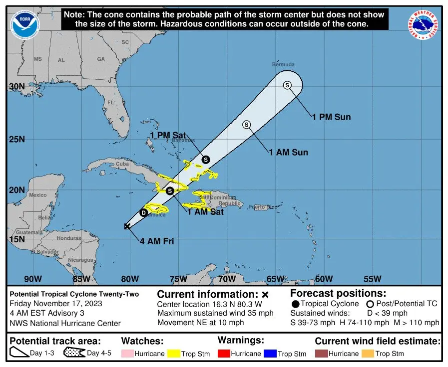 SANTO DOMINGO, República Dominicana.– SANTO DOMINGO, República Dominicana.- La Oficina Nacional de Meteorología (Onamet) informó que monitorea un potencial ciclón tropical, el cual se ubica a unos 415 kilómetros al oeste/suroeste de Kingston, Jamaica, posee vientos máximos sostenidos de hasta 55 kph y se desplaza hacia el noreste a una velocidad de 17 kph.