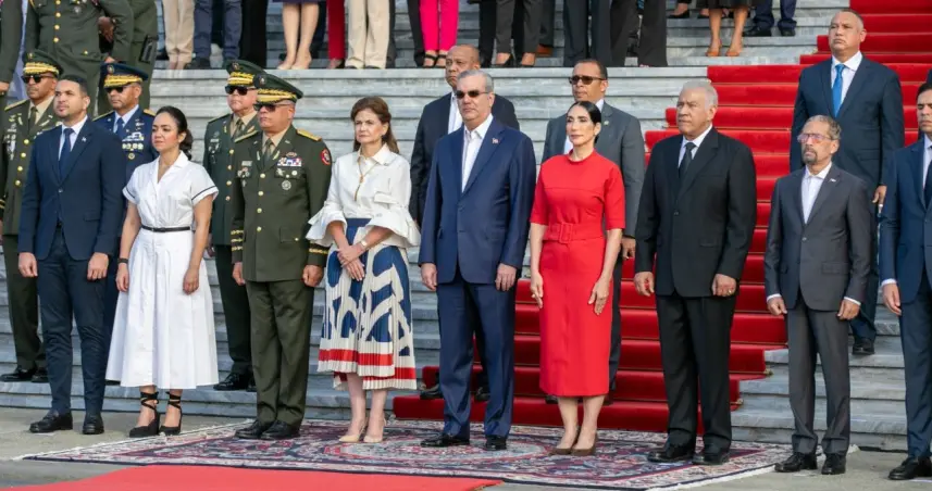 En el homenaje a la insignia tricolor de los dominicanos, en el Mes de la Patria 2025, que fue realizado en las escalinatas del Palacio Nacional, el mandatario estuvo acompañado de la vicepresidenta Raquel Peña y de la primera dama Raquel Arbaje.