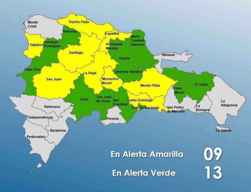 En este sentido, el desarrollo significativo de la nubosidad acompañado de tormentas eléctricas y ráfagas de viento están previstas para: El Seibo, Hato Mayor, Monte Plata, Sánchez Ramírez, La Romana, Monseñor Nouel, La Vega, Santiago, San José de Ocoa, San Cristóbal, Elías Piña, Independencia, Azua, San Juan, Puerto Plata, Valverde, Espaillat, Hermanas Mirabal, Duarte.