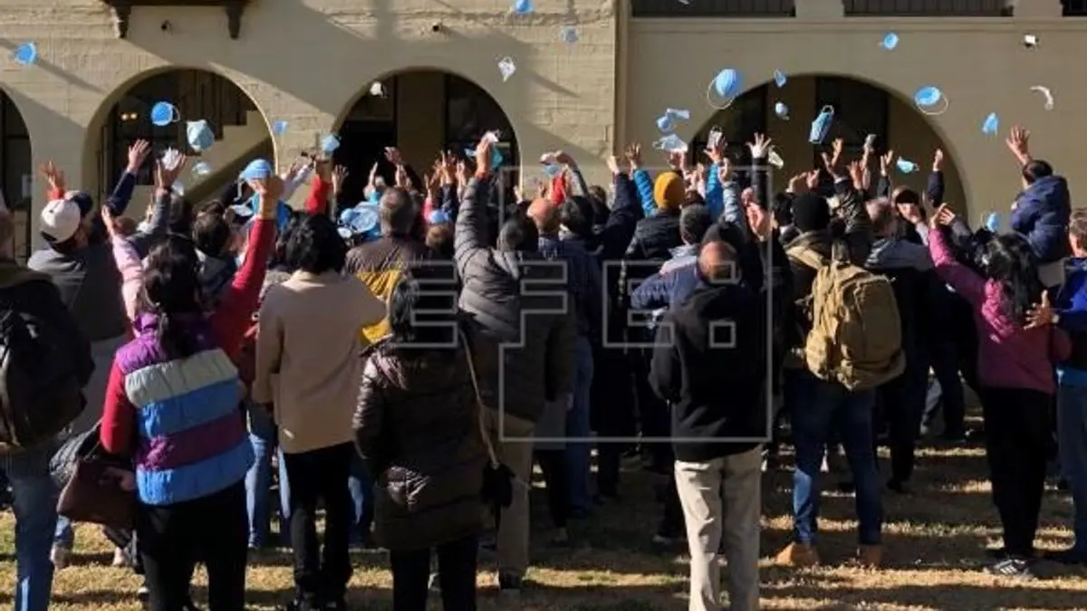 Medios locales mostraron una fotografía proporcionada por las autoridades de salud, donde el grupo se ve de espaldas lanzando los tapabocas al aire en celebración del fin de la cuarentena.