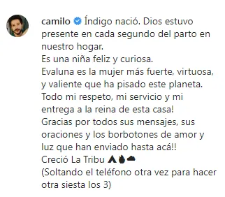 "Índigo nació. Dios estuvo presente en cada segundo del parto en nuestro hogar. Es una niña feliz y curiosa", fueron las primeras palabras del artista en su publicación.