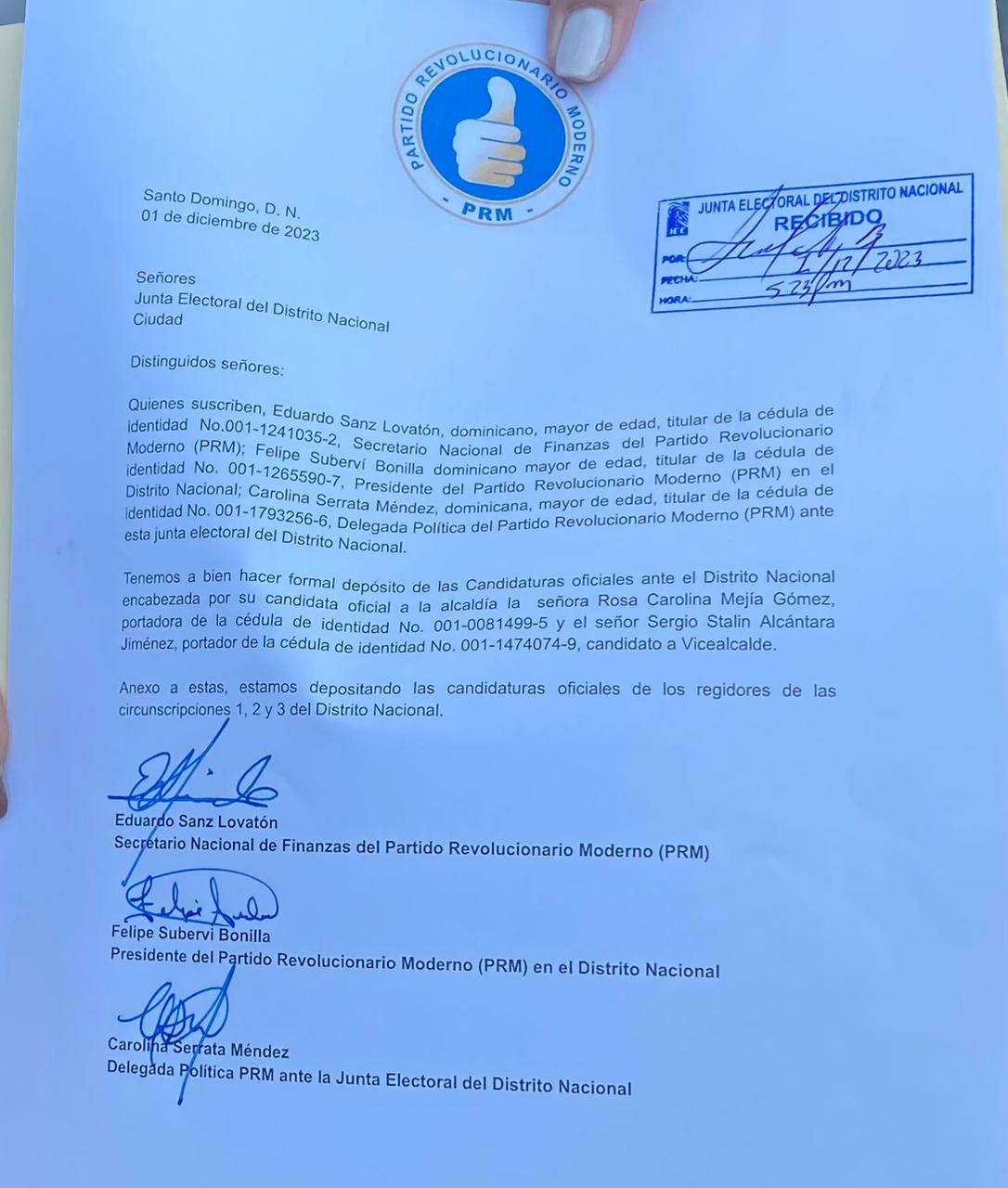 SANTO DOMINGO.- El Partido Revolucionario Moderno (PRM) inscribió la tarde de este viernes a los candidatos a las elecciones municipales, entre los que se incluye a la actual alcaldesa del Distrito Nacional (DN), Carolina Mejía, cuando solo faltan horas para cumplirse el plazo que por tercera ocasión otorgó la Junta Central Electoral (JCE) a los partidos políticos para presentar sus abanderados.