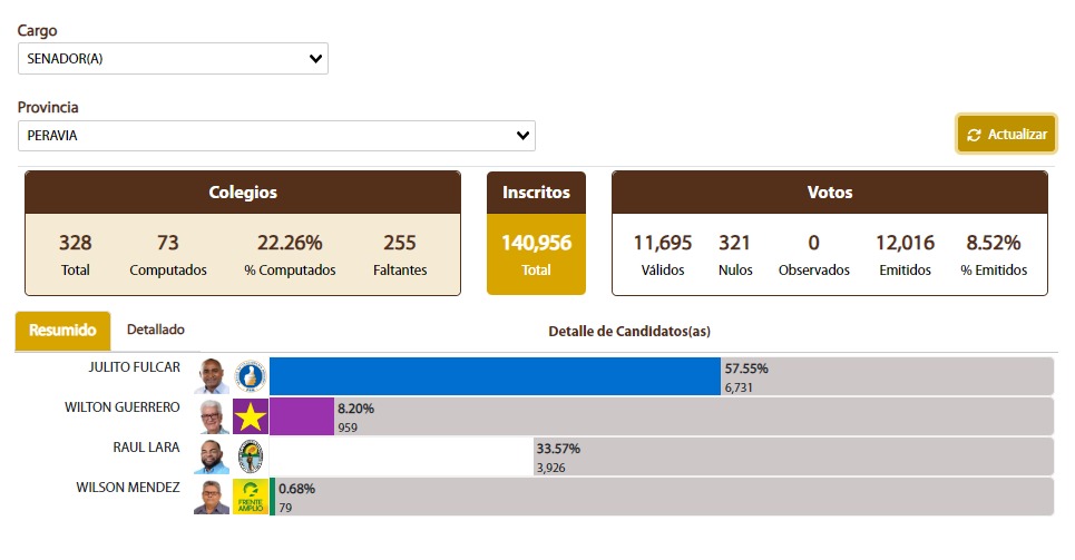 Santo Domingo. - El candidato a senador por la provincia Peravia y del Partido Revolucionario Moderno (PRM) Julito Fulcar, está adelante con un 57.55%, mientras que Raúl Lara, por el Partido Revolucionario Dominicano (PRD) lleva un 33.57% y le sigue Wilton Guerrero por el Partido de la Liberación Dominicana (PLD) con un 8.20%.