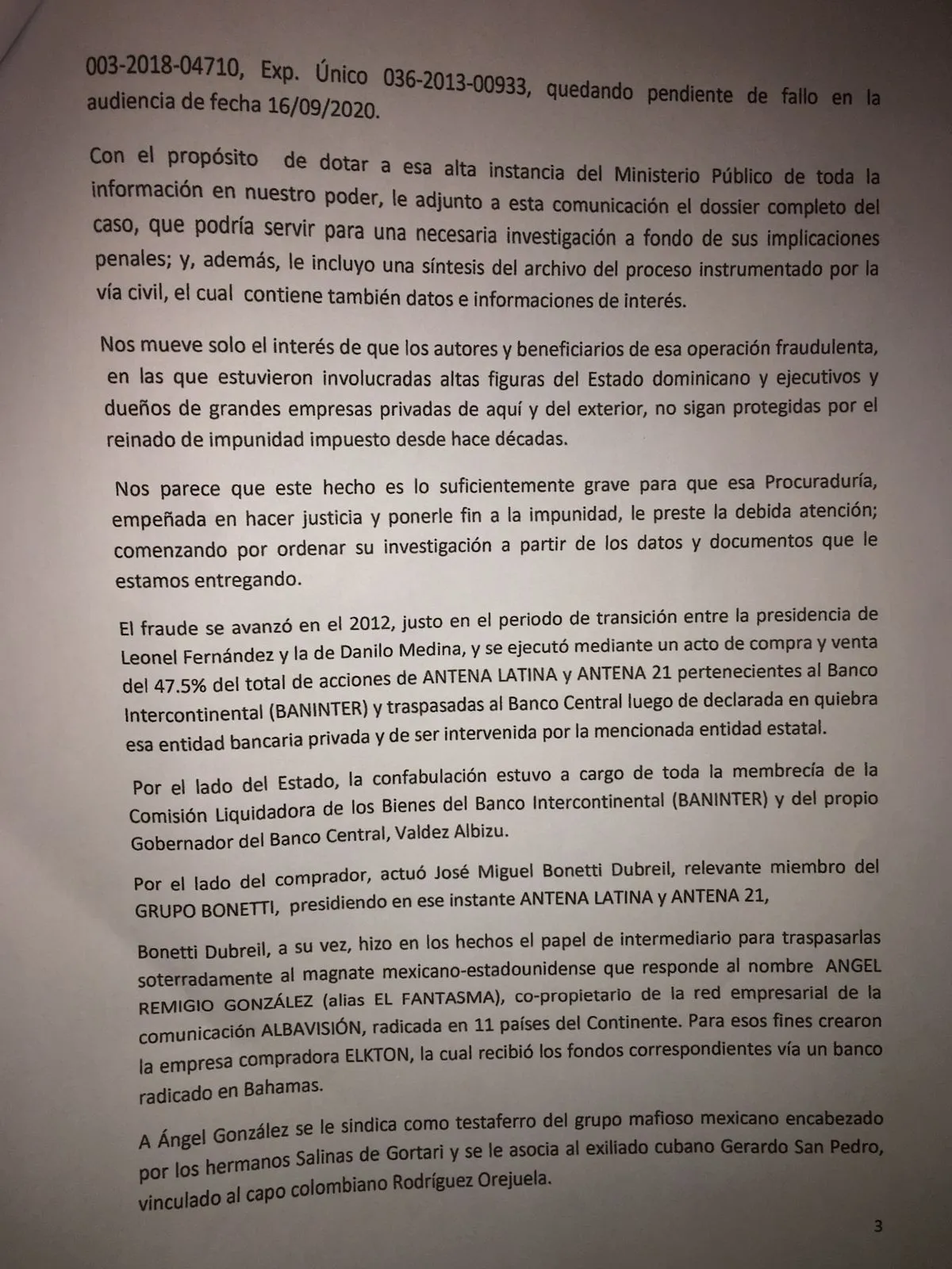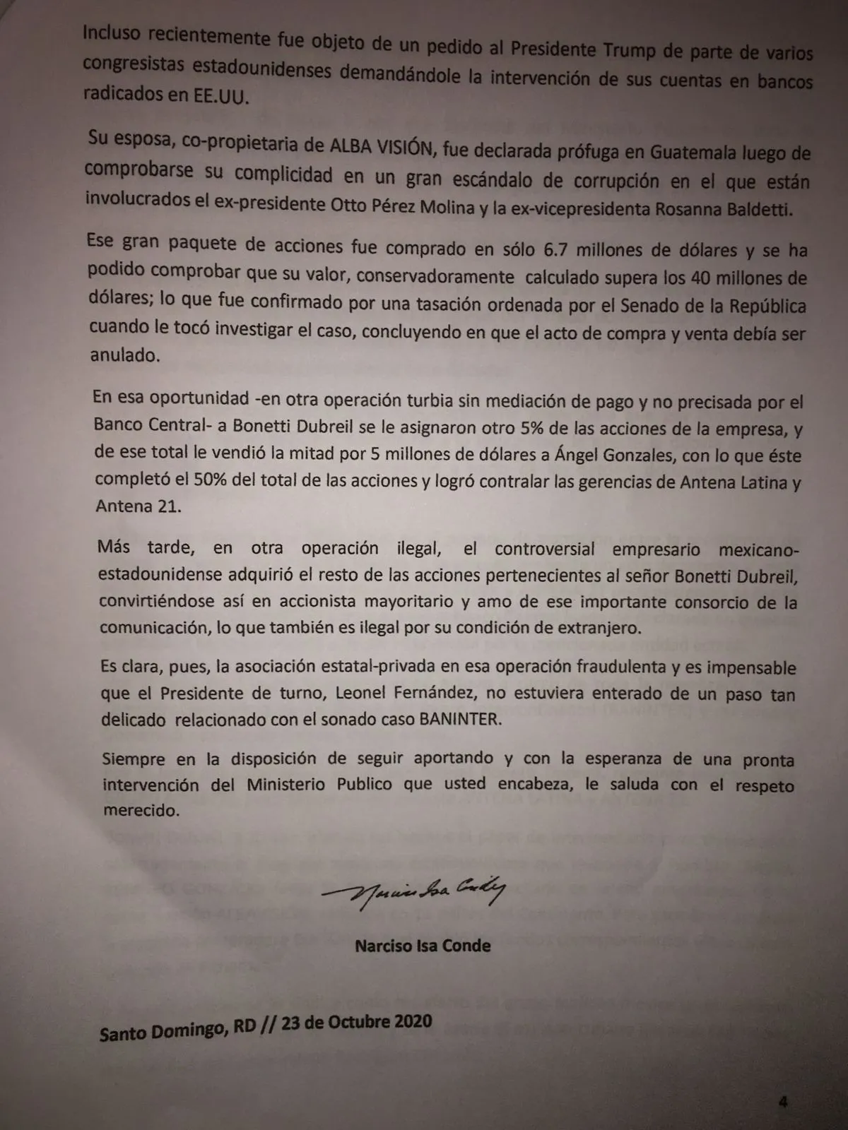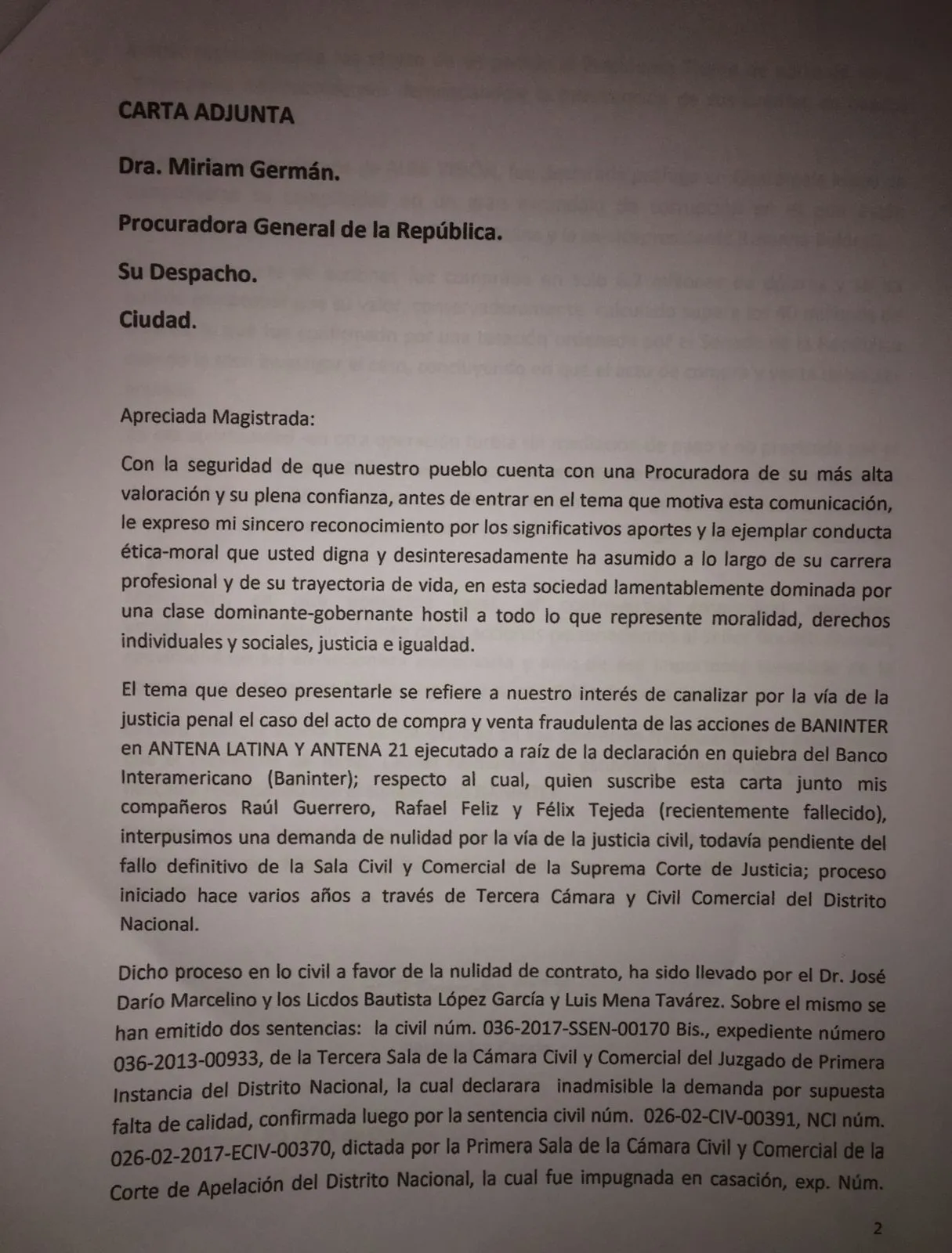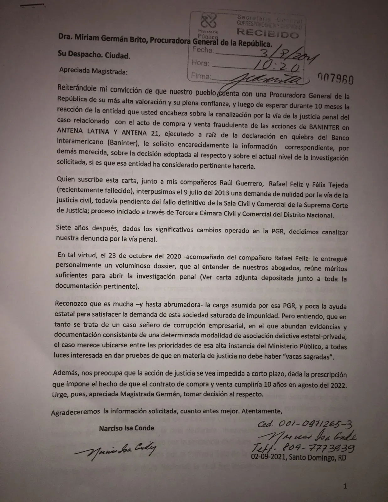 SANTO DOMINGO.- En una carta dirigida a la procuradora Miriam Germán Brito, Narciso Isa Conde pidió dar urgente prioridad a la investigación sobre la venta irregular de las señales de Antena Latina y Antena 21 que en agosto de 2022 cumplirá 10 años.
