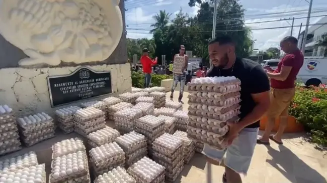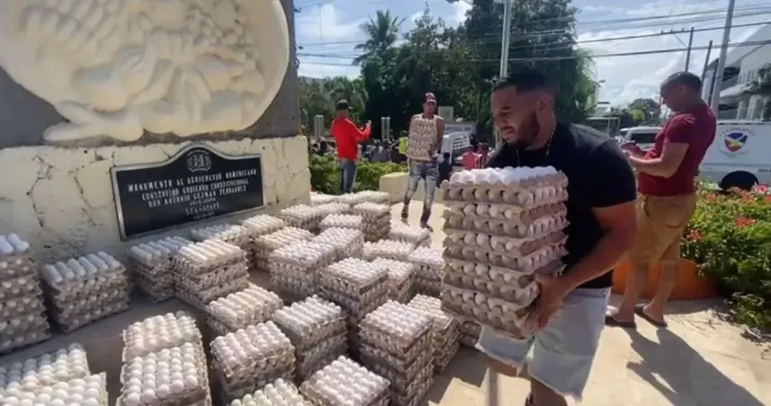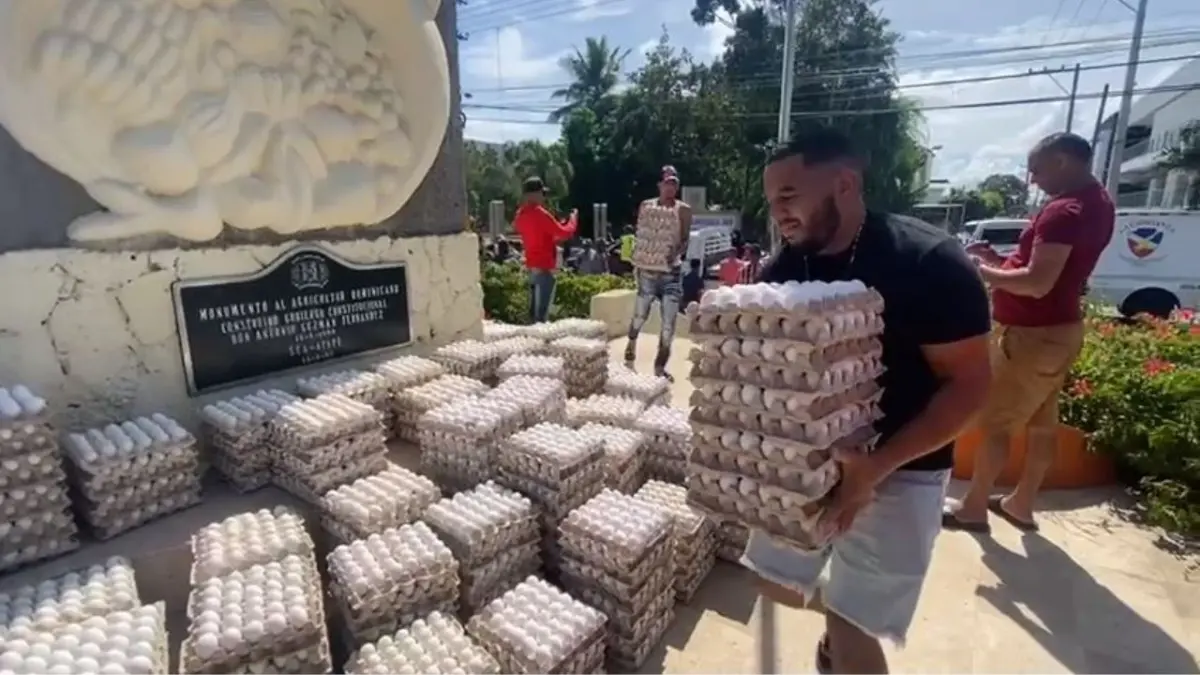 REDACCIÓN.- Productores de huevos prestaron pacíficamente regalando huevos a los ciudadanos, frente a la plaza El Agricultor en Moca, en demanda de atención del Gobierno ante el cierre de la frontera.