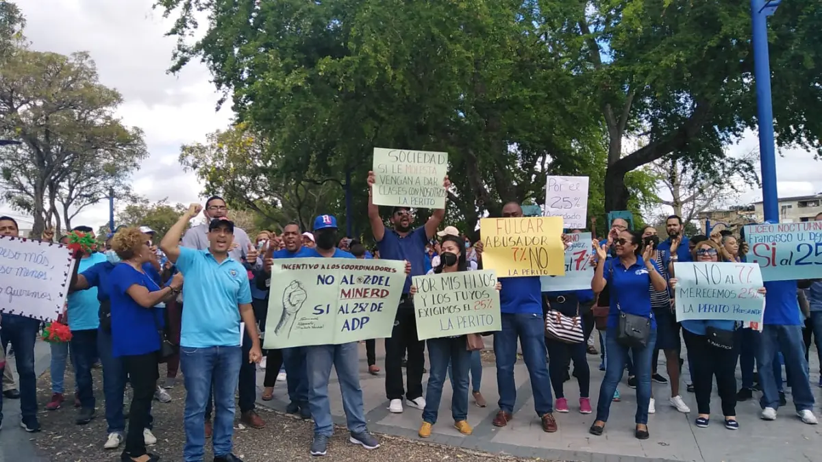 SANTO DOMINGO.- Los profesores de las escuelas que pertenecen al Distrito Escolar 15-04, en el Distrito Nacional, se concentran para realizar marcha hasta esa división del Ministerio de Educación y exigir un aumento salarial del 25 por ciento y otros reclamos por los que han hecho un paro de docencia este viernes.