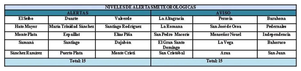 Debido a las lluvias que se esperan para las próximas 24 a 48 horas, la Oficina Nacional de Meteorología (Onamet) mantiene los niveles de Alertas y Avisos meteorológicos ante posibles crecidas repentinas de ríos, arroyos y cañadas, así como también, la ocurrencia de deslizamientos de tierra e inundaciones urbanas hacia las provincias: