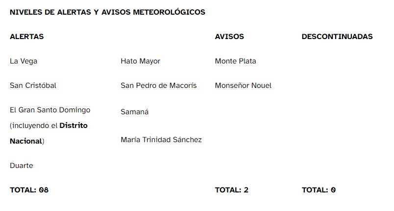 La ONAMET mantiene los niveles de alertas y avisos para varias provincias ante posibles crecidas repentinas de ríos, arroyos y cañadas, generadores de inundaciones urbanas y/o rurales, así como, deslizamientos de tierra.