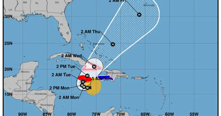 A las 5:00 de la mañana de este domingo, el centro del fenómeno fue localizado cerca de la latitud 16.3 norte y longitud 76.3 oeste, aproximadamente a 195 kilómetros al sur/sureste de Kingston, Jamaica, y a unos 450 kilómetros al sur/suroeste de Guantánamo, Cuba, moviéndose lentamente hacia el oeste a unos 7 km/h.