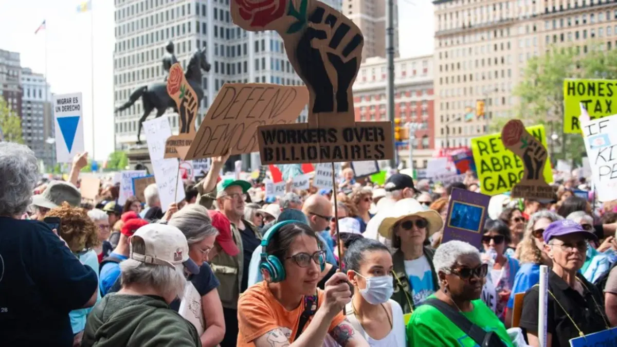 La Federación Estadounidense del Trabajo y Congreso de Organizaciones Industriales convocó más de mil protestas por todo el país, especialmente en los estados demócratas de California, Nueva York e Illinois, bajo el lema ‘Los trabajadores por encima de los multimillonarios».