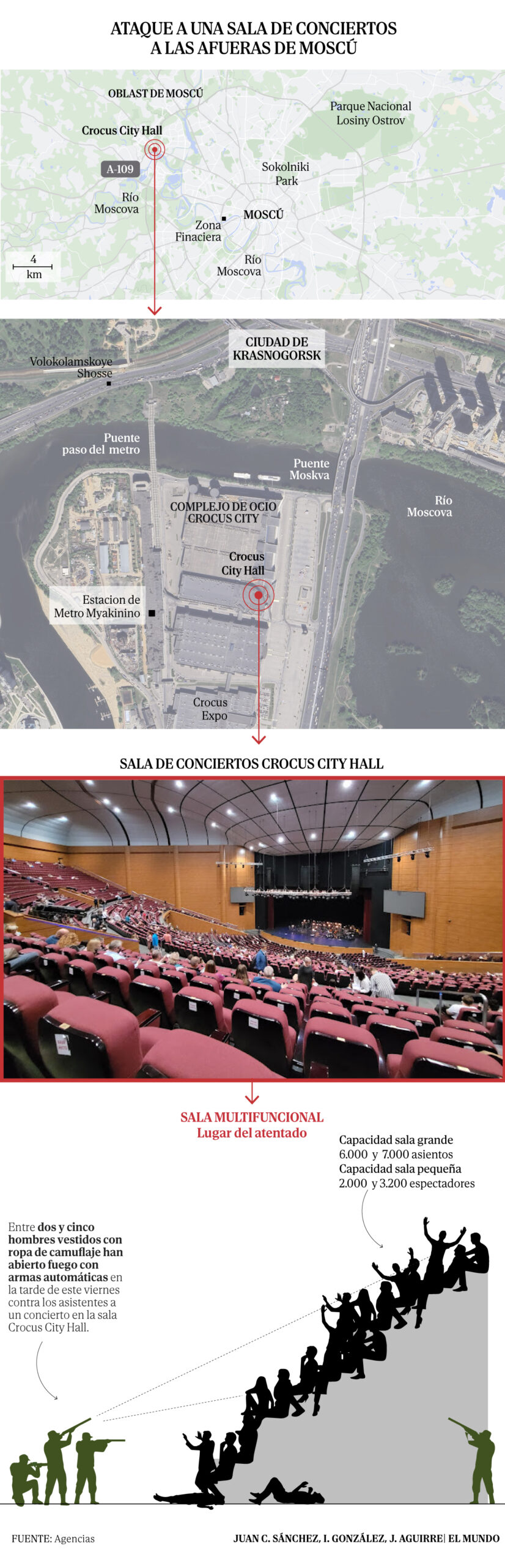 Según fuentes policiales, el viernes 22 de marzo, unos desconocidos protagonizaron este viernes 22 de marzo, un tiroteo durante un concierto de rock en la ciudad de Krasnogorsk y luego han provocado un incendio en el edificio que ha afectado a una superficie de casi 13,000 metros cuadrados. La sala se encuentra en un centro comercial que aloja otros establecimientos como hoteles y restaurantes.