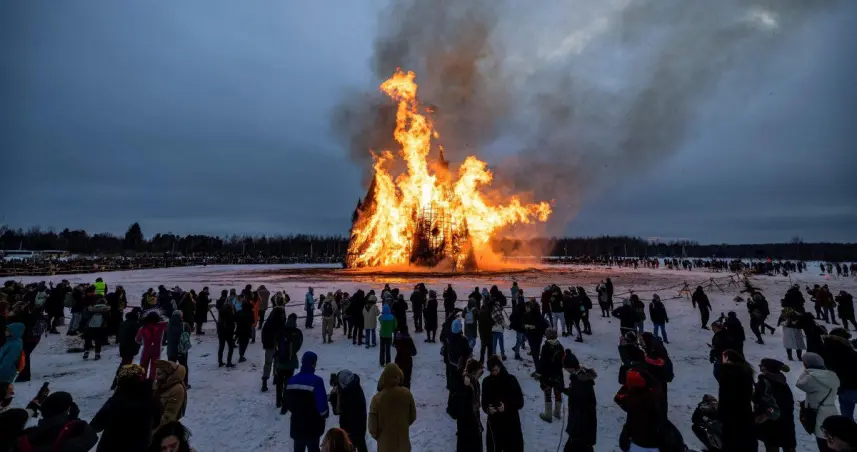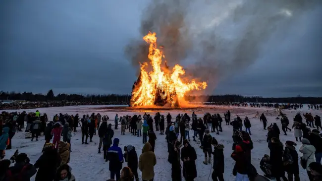 RUSIA.– RUSIA.- Una especie de castillo gigante construido con materiales naturales fue quemado el pasado 13 de marzo en el Parque de Arte Nikola-Lenívets, en la región rusa de Kaluga, como parte de las celebraciones de la Máslenitsa, una festividad cristiana ortodoxa celebrada la última semana antes de la Cuaresma ortodoxa que simboliza la despedida del invierno y la llegada de la primavera.