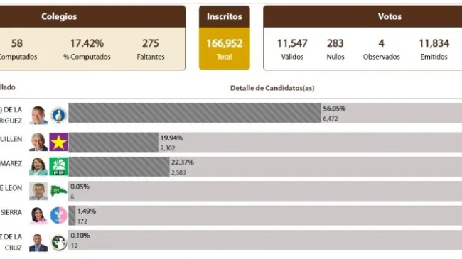 Con 9,323 votos computados, correspondientes al 16.82% de los colegios computados, Ortíz Díaz cuenta con 57.60%.