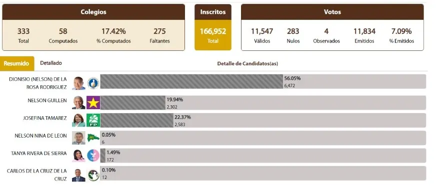 Le sigue Sergio Antonio Cedeño del PLD con 40.21%, Néstor Muñoz Rosado del PRSC con 1.88%, César Gerónimo del PPT con 0.10%, Sandy Castillo Lauriano de GenS con 0.05% y Carlos Bernardino Pascual de PED con 0.16%.