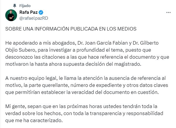Rafael Paz dice apoderó a sus abogados para investigar supuesta orden de arresto en su contra