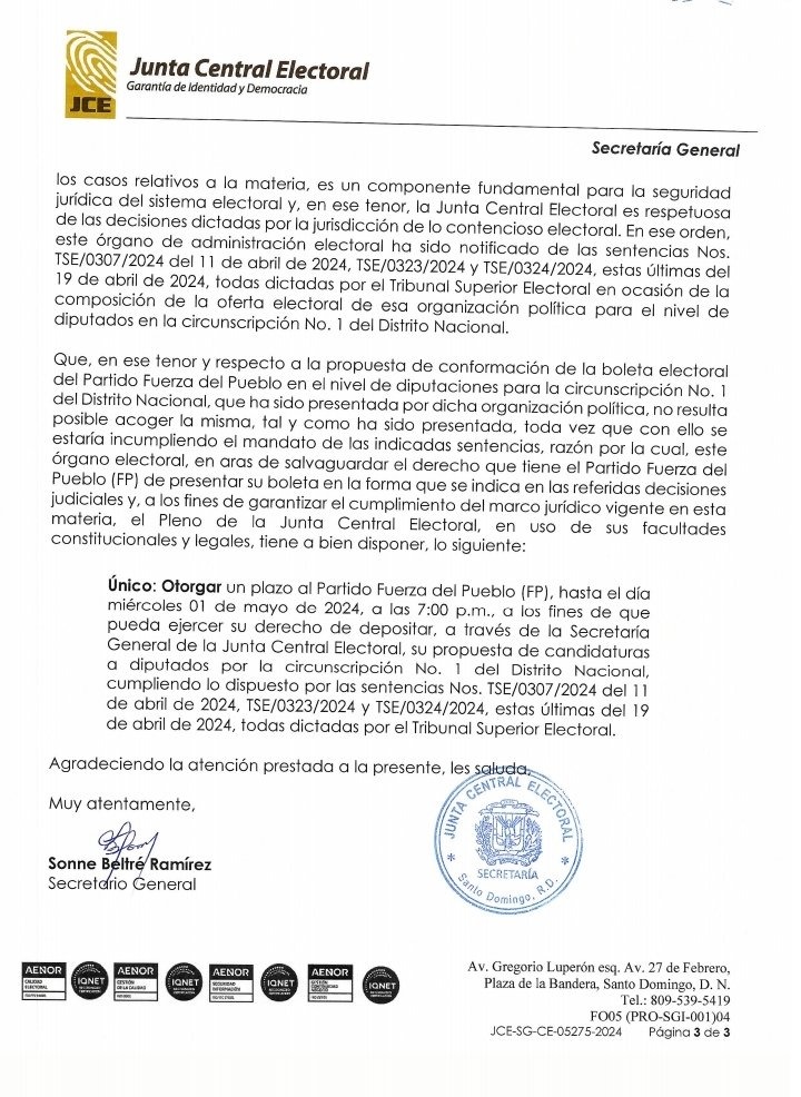 Por lo que otorgó un plazo hasta el miércoles a la Fuerza del Pueblo para depositar su propuesta de candidaturas a diputados en la Circunscripción 1 del Distrito Nacional tal como lo disponen tres sentencias del Tribunal Superiror Electoral (TSE).