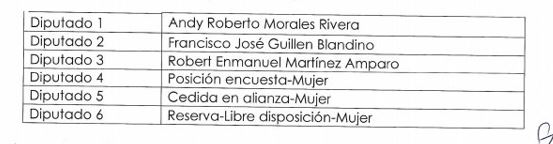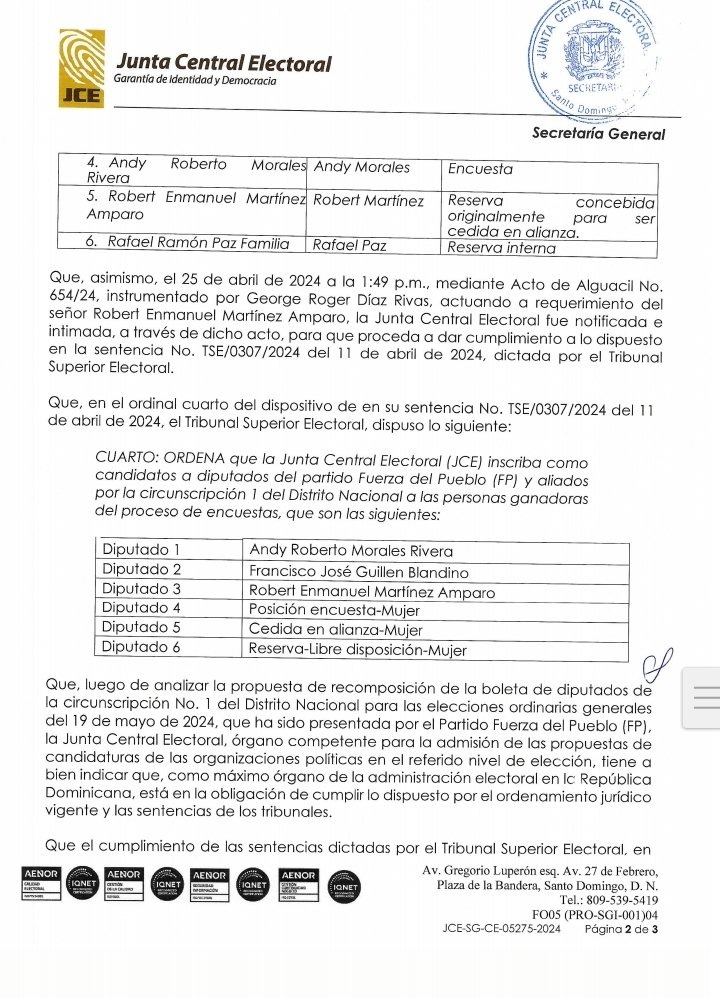La JCE ordena que se inscriba como candidatos a diputados del la Fuerza del Pueblo y aliados por la circunscripción 1 del Distrito Nacional a las personas ganadoras del proceso de encuestas, que son las siguientes: