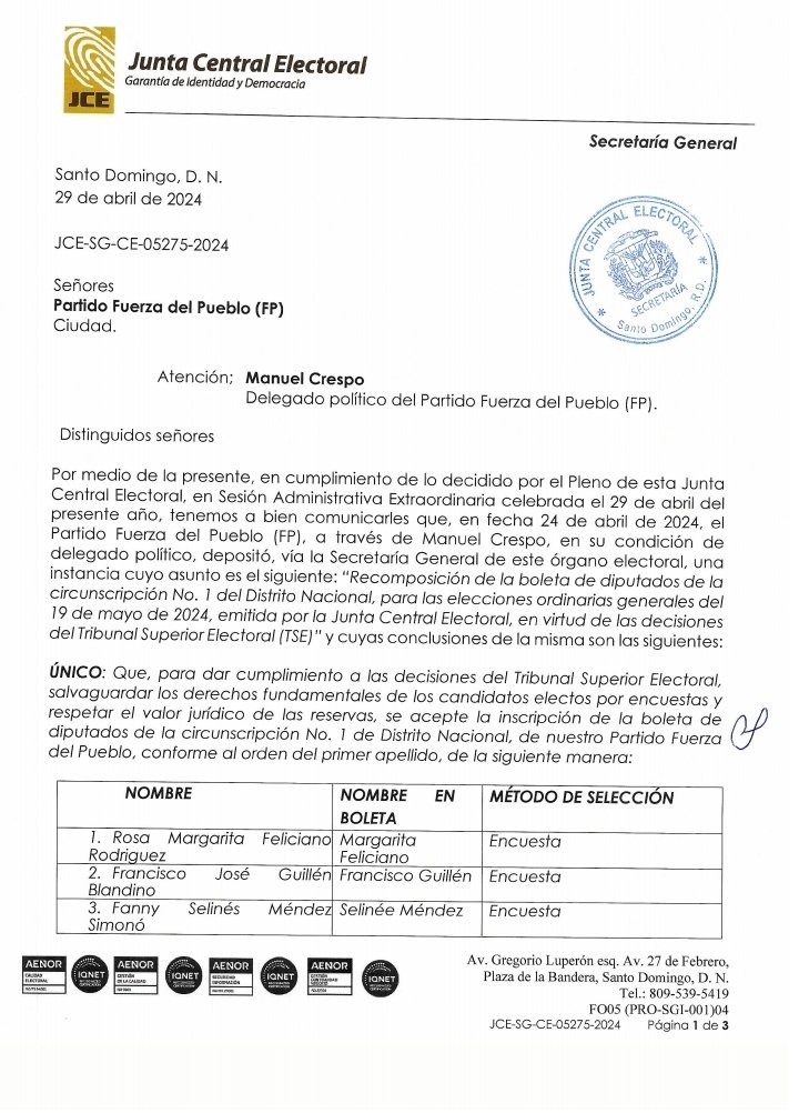 Santo Domingo.– SANTO DOMINGO.- Pese a que hace varios días la Fuerza del Pueblo depositó una propuesta con los nombres de Rafael Paz y Selinée Méndez junto a otros tres aspirantes, la Junta Central Electoral (JCE) no acogió la inscripción de candidatos a diputados de este partido en la circunscripción 1 del Distrito Nacional, en vista de que incumple lo ordenado por el Tribunal Superior Electoral.