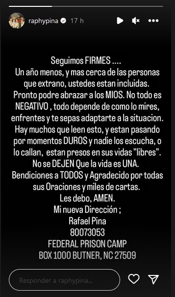 Redacción.- El productor Raphy Pina cumplió este 24 de mayo su primer año de prisión de la condena que le fue impuesta por posesión ilegal de armas, expresó en un mensaje que pronto podrá abrazar a los suyos.