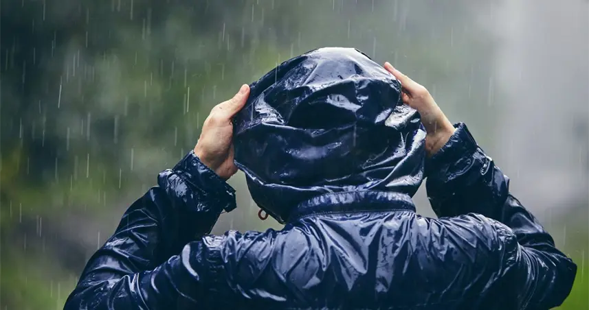 La imagen muestra a una persona de espaldas, vestida con una chaqueta impermeable oscura con capucha, bajo una lluvia intensa.