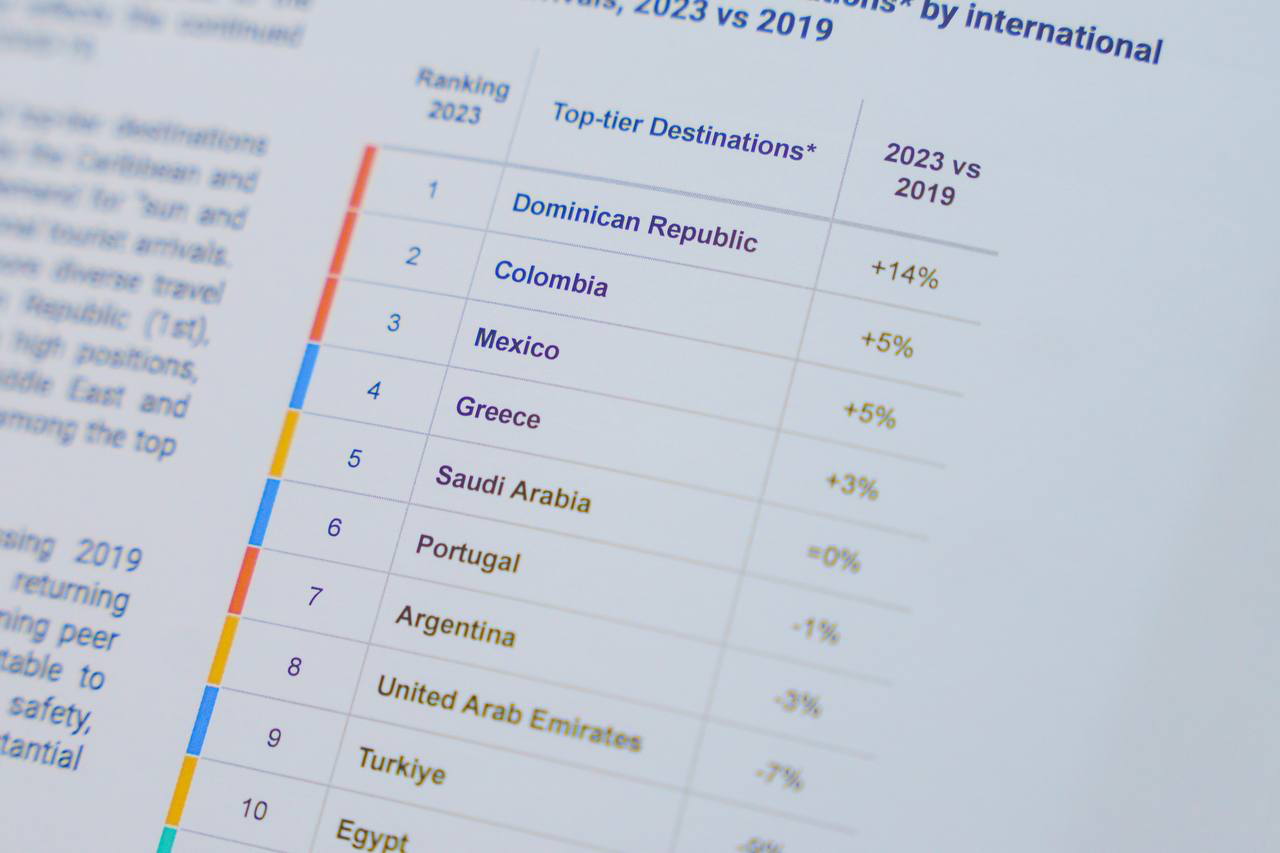 El país encabeza la lista con un 14% de visitantes más que en 2019, recibidos por vía aérea en 2023; le siguen Colombia y México, ambos con un 5% más, seguidos por Grecia (+3%) y Arabia Saudita (0%) con igual número de llegadas de vuelos que en 2019.