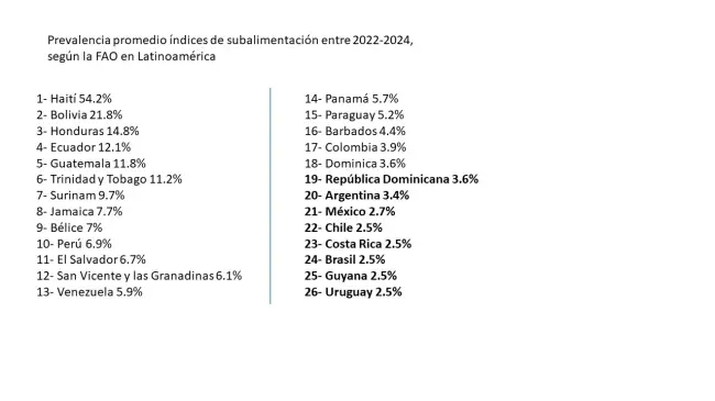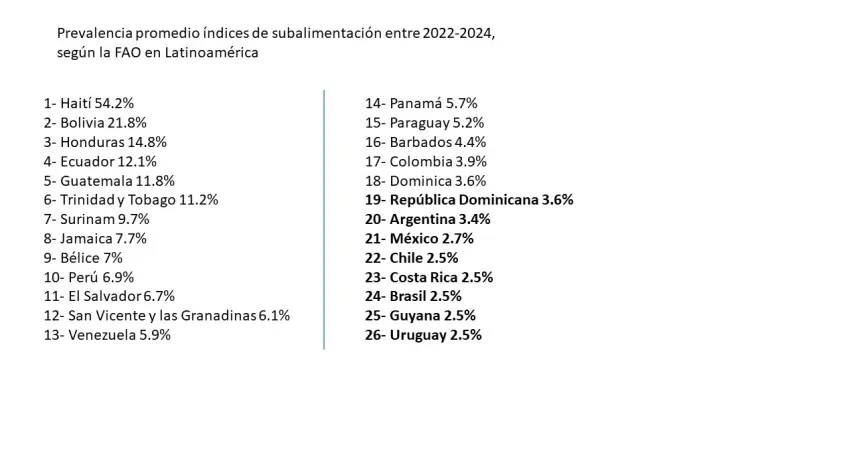 México con 2.7% y Argentina con 3.4% superan el 3.6% de República Dominicana en la prevalencia de menores índices de subalimentación y hambre en Latinoamérica.