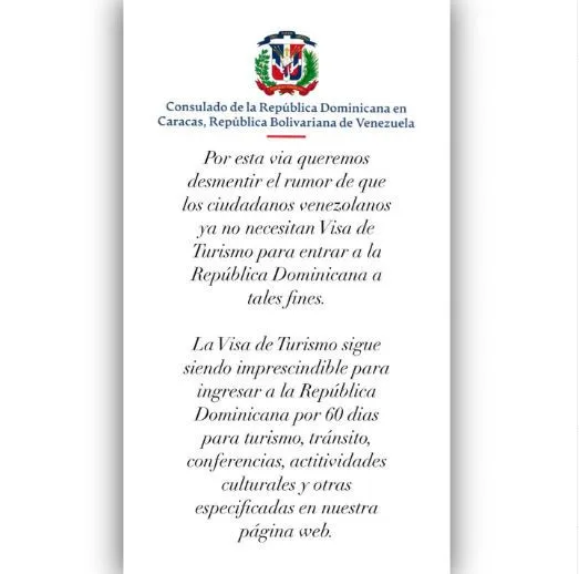 “Por esta vía queremos desmentir el rumor de que los ciudadanos venezolanos ya no necesitan visa de turismo para entrar a RD”.