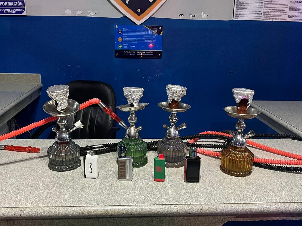 Durante los allanamientos, se ocuparon seis hookahs de diferentes colores, 13 cigarrillos electrónicos (vapes) de distintos colores, y un arma de fuego tipo pistola, marca Arcus, calibre 9mm, negro y gris, con serie No. 23FG400688, junto con su cargador y 13 cápsulas, sin la documentación vigente.