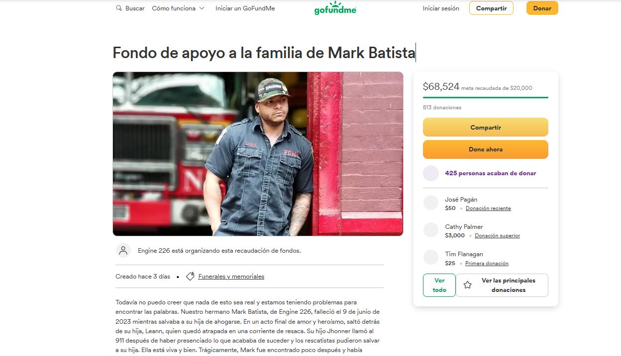 REDACCIÓN.– REDACCIÓN.- La estación Engine 226 en Brooklyn, Nueva York, en la que laborada el dominicano Mark Batista, quien falleció tras lanzarse al océano para rescatar a su hija el viernes pasado, organizó una recaudación en la página GoFoundMe para "apoyar a la familia durante este difícil momento".