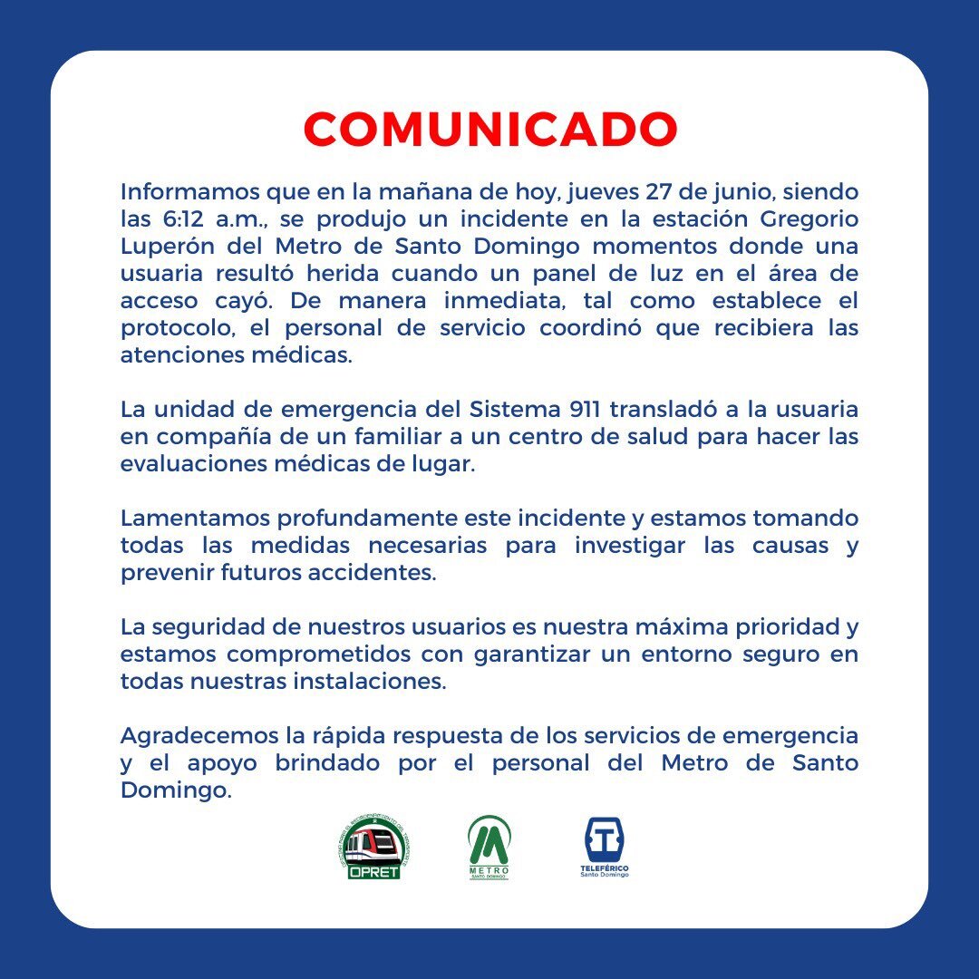 Santo Domingo.– SANTO DOMINGO.- La Oficina para el Reordenamiento del Transporte (Opret), informó que recibe atenciones médicas la mujer resultó herida tras la caída de un panel de luz en el área de acceso del Metro Santo Domingo.