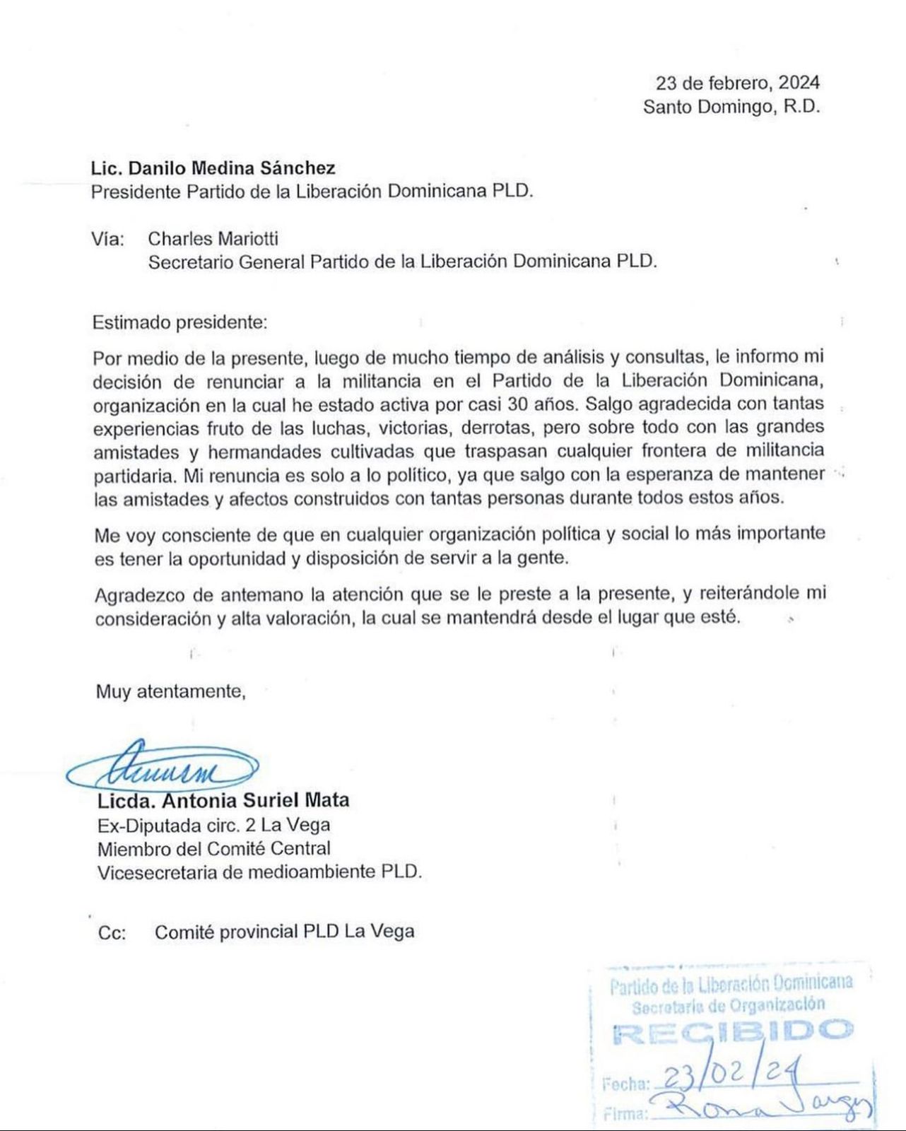 Santo Domingo.– Santo Domingo.- Antonia Suriel Mata, ex diputada por Jarabacoa y Constanza del Partido de la Liberación Dominicana (PLD), renunció a la militancia en el partido, por el cual había estado aproximadamente 30 años según expresó en un comunicado.