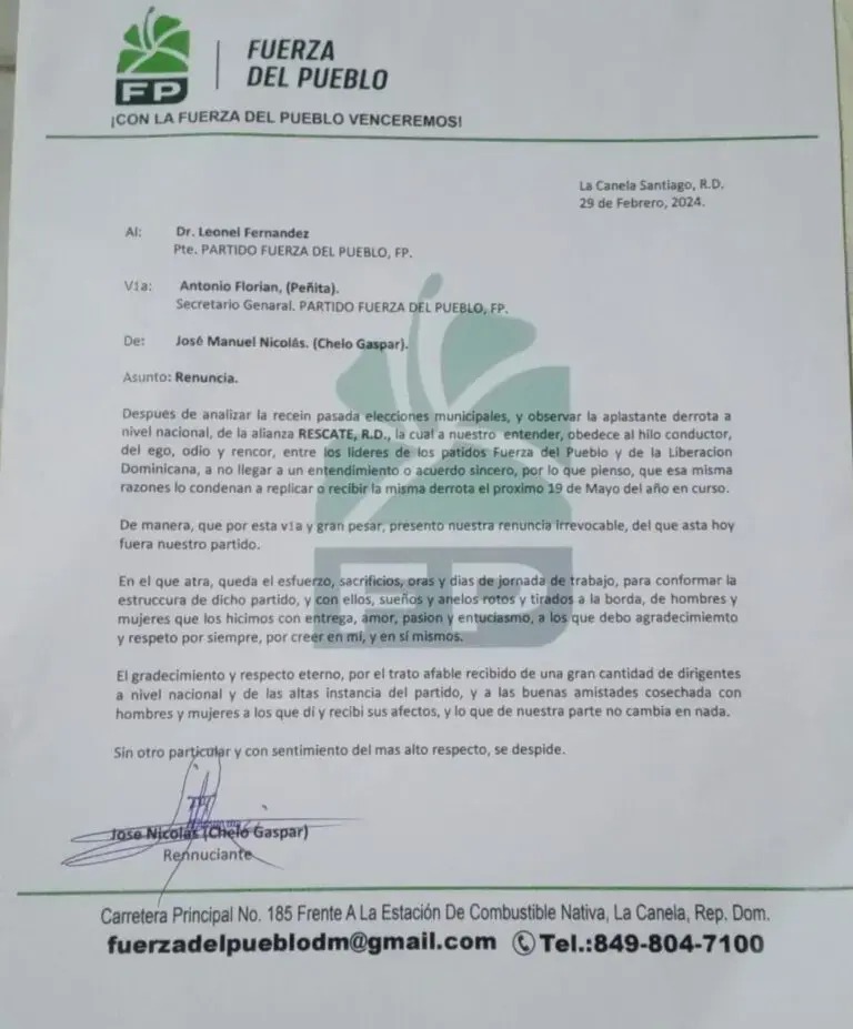 Santiago.– SANTIAGO.- El presidente de la Fuerza del Pueblo en el distrito municipal La Canela, José Nicolás (Chelo) Gaspar, anunció su renuncia de esa organización política, junto con la mayoría de la dirigencia local.