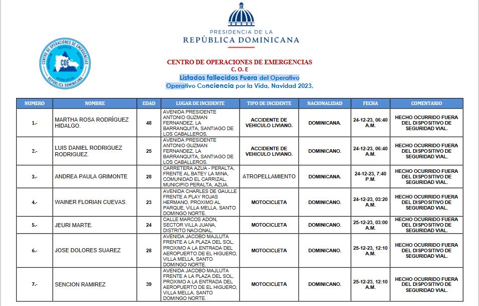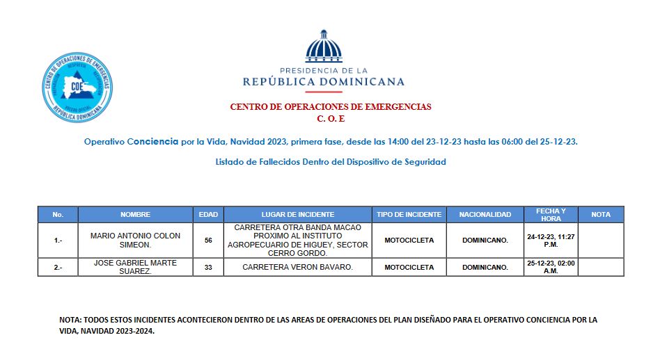 Santo Domingo.– SANTO DOMINGO.- El Centro de Operaciones de Emergencias (COE) reportó en el segundo boletín del operativo navideño “Conciencia por la Vida, Navidad y Año Nuevo 2023- 2024”, nueve personas fallecidas por accidentes de tránsito, de las cuales dos fueron dentro del dispositivo del operativo navideño.