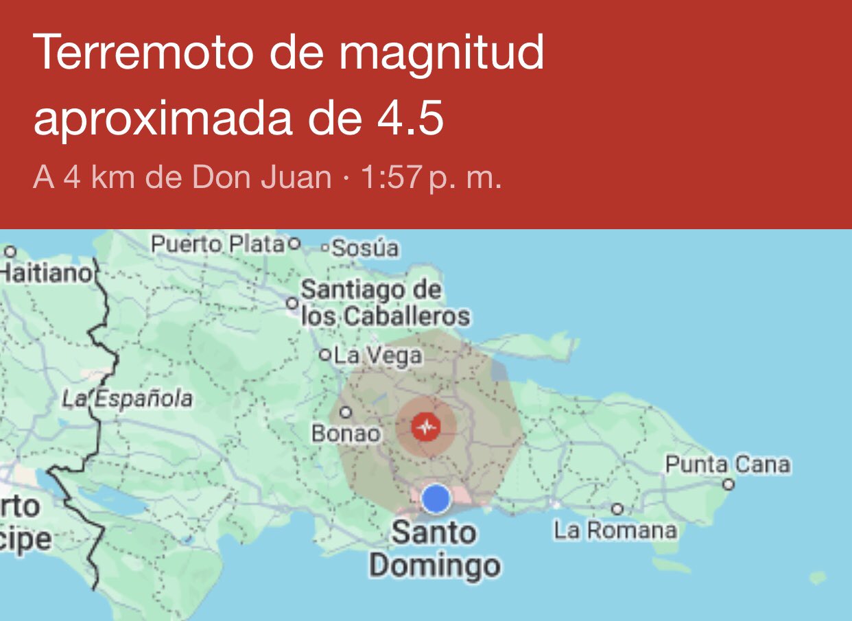 REDACCIÓN.- Un temblor de magnitud 4.5 grados, se registró la tarde de este miércoles con epicentro a 4 kilómetros de Don Juan, Monte Plata.