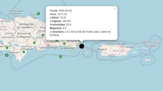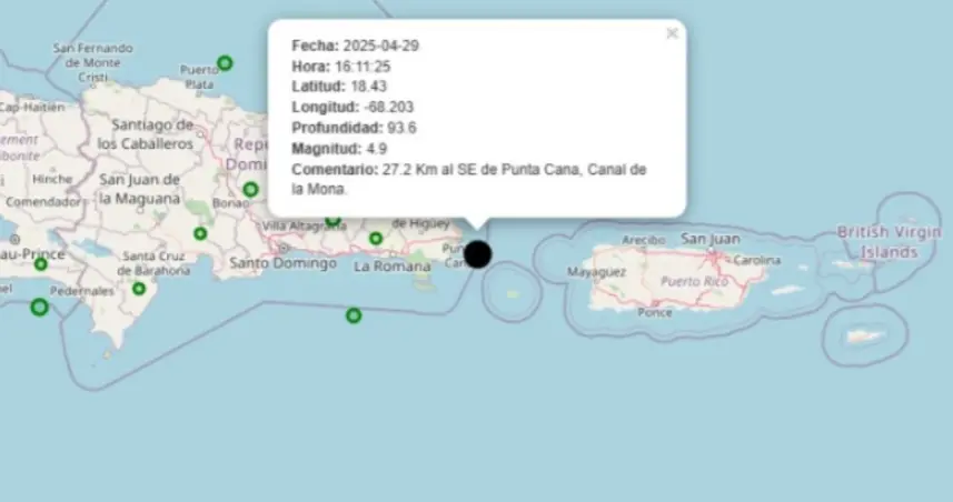 REDACCIÓN. - Un temblor de tierra de magnitud 4.9 en la escala de Richter se reportó la tarde de este martes al este de la República Dominicana, en la región del Pasaje de la Mona, a unos 27.2 kilómetros al sureste de Punta Cana, provincia La Altagracia.