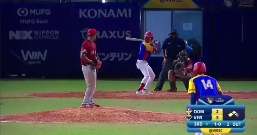 En la séptima y última entrada los venezolanos añadieron una carrera con pitcheo desviado de Jorge Jiménez y anotó Jesús Chávez para colocar el partido 5 a 4 a favor de los dominicanos, y llegó un cambio de lanzador del dirigente José Canó buscando un out, el que consiguió cuando el pitcher Víctor Padilla dominó a Erinyer Barceló por la vía 1-3.