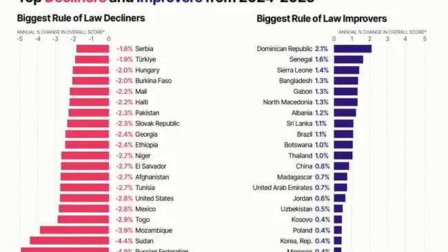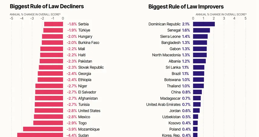 - El informe del World Justice Project (WJP), publicado este martes, revela que la República Dominicana logró el mayor progreso mundial en el fortalecimiento del Estado de derecho durante el último año, superando a países como Senegal (1.6%), Sierra Leona (1.4%) y Bangladesh (1.3%).