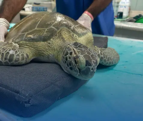Según el equipo veterinario del Acuario Nacional, la tortuga llegó con signos de deshidratación, una laceración visible en el ojo izquierdo y múltiples heridas en sus aletas delanteras.