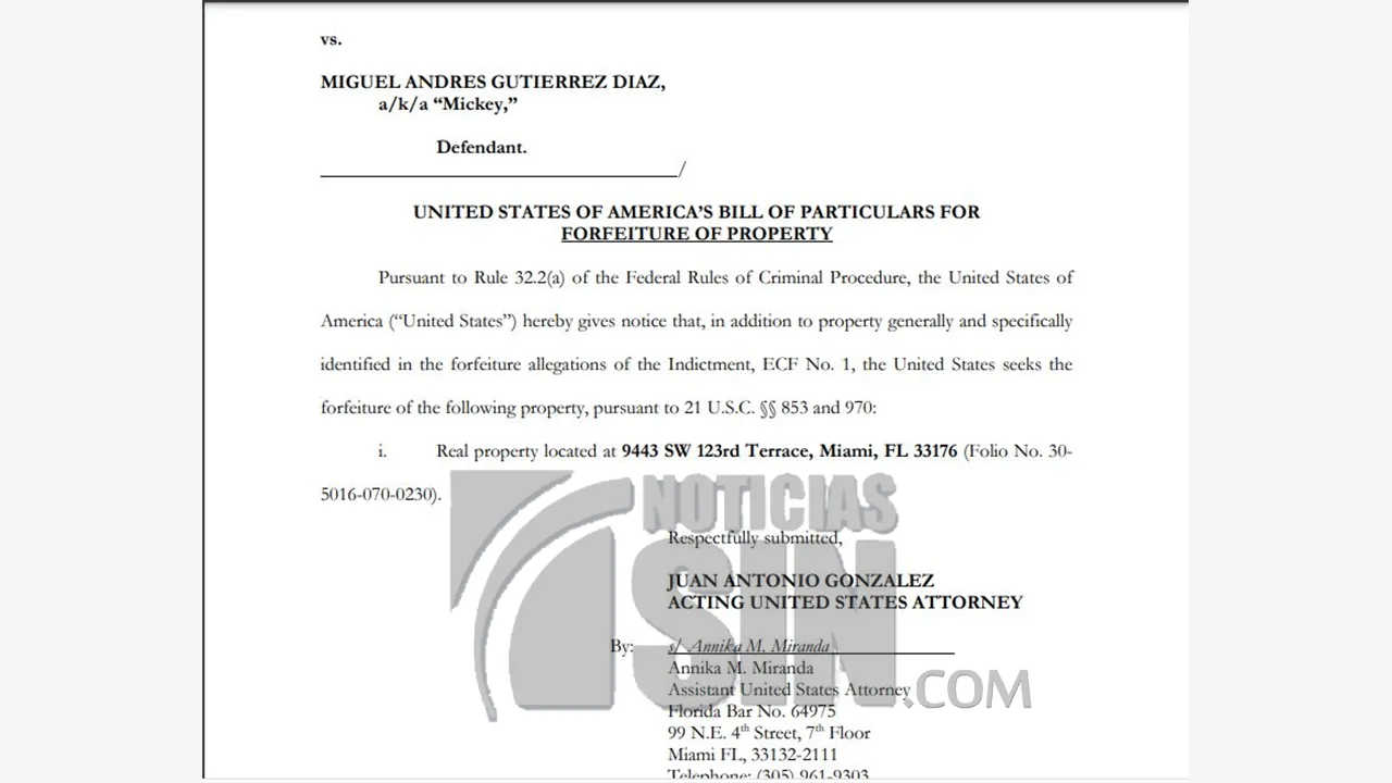 Este lunes, el fiscal federal Juan Antonio González sometió la solicitud diciendo que “además de las propiedades ya identificadas en la acusación (aun no hecha pública), el Estado busca la confiscación de esta propiedad” ubicada en la dirección “9443 SW 123rd Terrace”, en el sector Oak Ridge Falls, cerca del reconocido centro comercial The Falls, al sur de la ciudad de Miami.