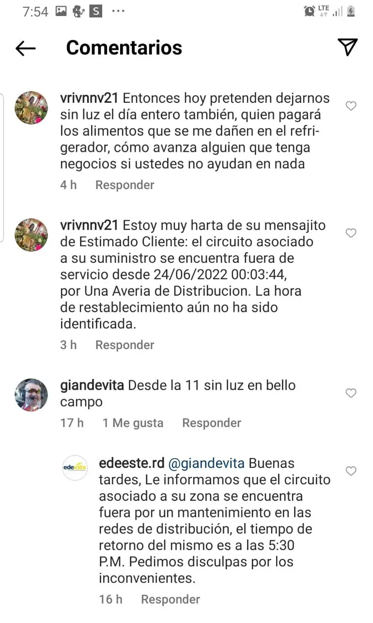 "Estamos SDN Sec 05 sin luz desde las 7. Anoche fue por mantenimiento al metro, hoy avería y esas son las excusas".Según las denuncias, las secciones que son más afectadas son el circuito 02,03,04,05 y 06 en los que se encuentran sectores como Sol de Luz, El Gómez, Casa Vieja, Buena Vista I y II, Colonia de los Doctores, El Edén, El Primaveral, El Dorado, entre otras comunidades. Ante esta situación, los residentes se desahogan por las redes, además se quejan por el mal servicio al cliente.