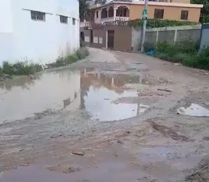 Santo Domingo.– Santo Domingo.- Con agua aposada, hoyos, lodos y polvo se encuentra la entrada de la calle Los Rieles, del sector Villa Cesarina, ubicado en la provincia San Pedro de Macorís.