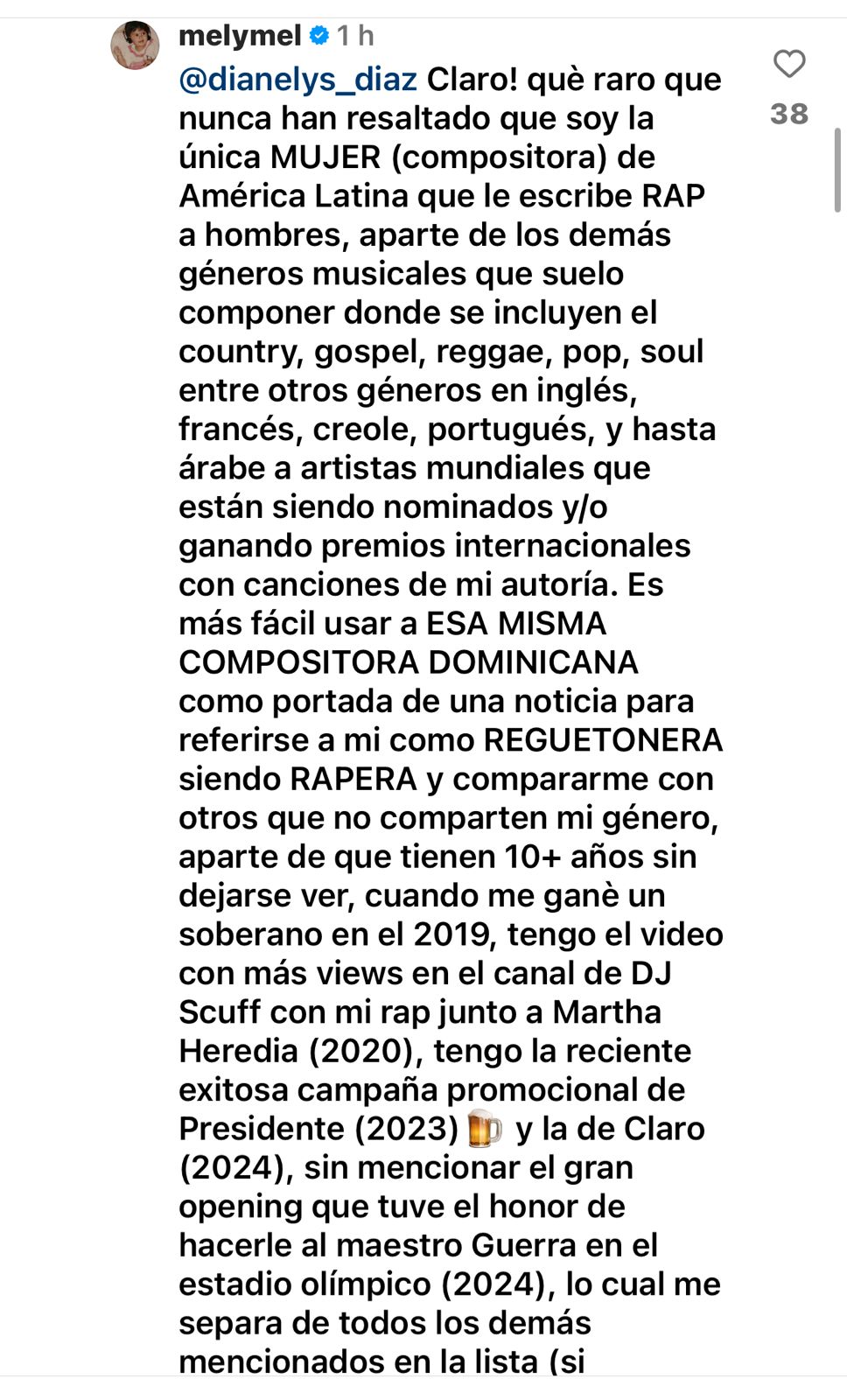 "Cuando me gané un Soberano en el 2019, tengo el video con más views en el canal de DJ Scuff con mi rap junto a Martha Heredia (2020), tengo la reciente exitosa campaña promocional de Presidente (2023) IP y la de Claro (2024), sin mencionar el gran opening que tuve el honor de hacerle al maestro Guerra en el estadio olímpico (2024), lo cual me separa de todos los demás mencionados en la lista (si hablamos de carreras activas), pero estamos en dominicana, los aportes nunca generan LIKES, los chismes, ataques y controversias, si generan LIKES… los entiendo!", continuó.