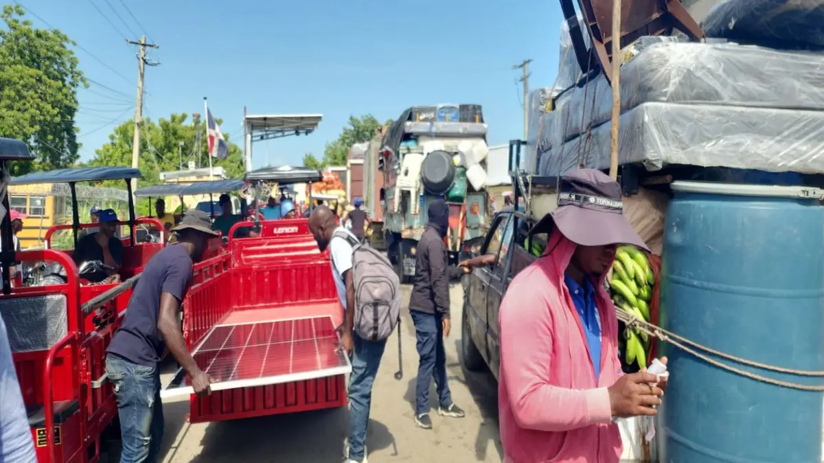 En distintas zonas de la región fronteriza se observaron largas filas de camiones, camionetas y otros vehículos cargados con familias haitianas que decidieron regresar a Haití, en medio de los operativos de control migratorio desplegados por las autoridades.