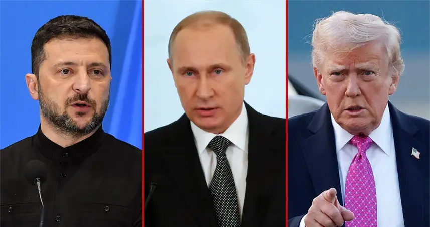 El presidente de Ucrania, Volodímir Zelenski; el presidente de Rusia, Vladímir Putin; y el presidente de Estados Unidos, Donald Trump.