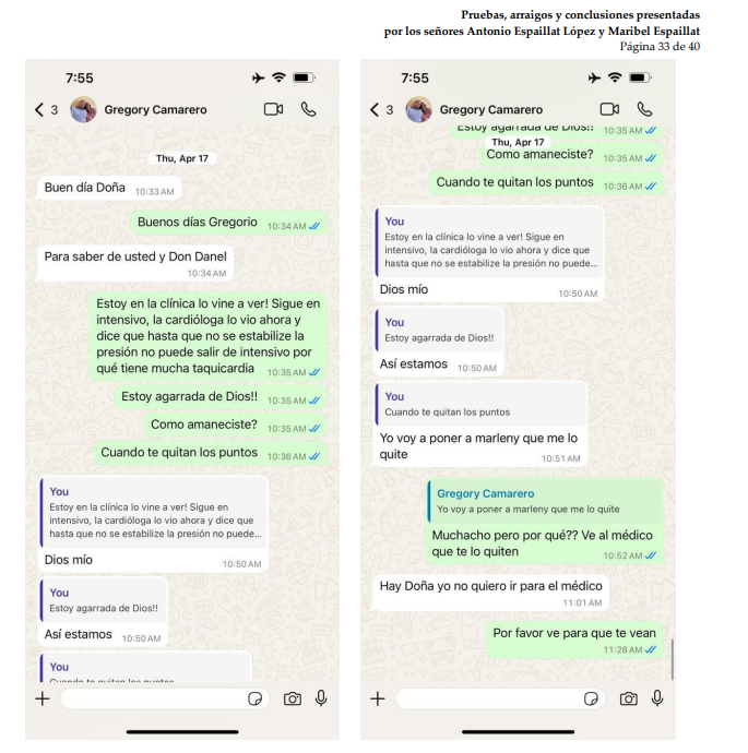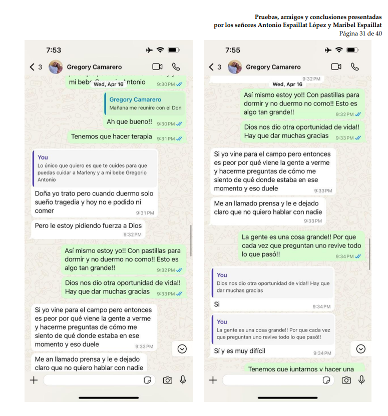 En ese sentido, la defensa de los imputados presentó como pruebas conversaciones entre Maribel y Gregory, donde alegan que el trato siempre fue amable.