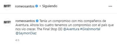 “Tenía un compromiso con mis compañeros de Aventura. Ahora los cuatro tenemos un compromiso con el país que nos vio crecer. The Final Stop”, escribió Santos junto a un video donde se le ve en la playa y más adelante sale el nombre “Aventura”.