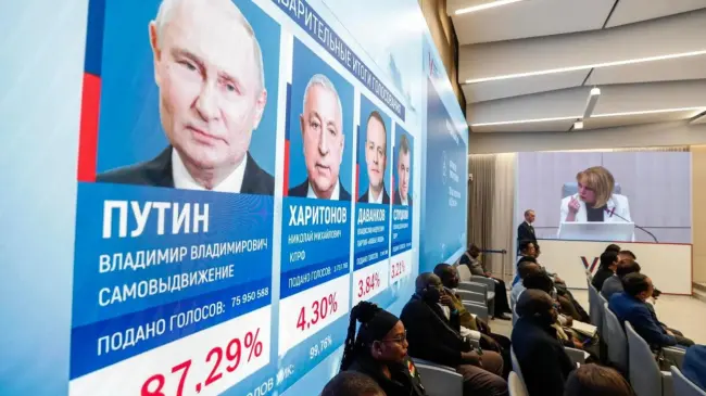 Putin fue reelegido para un quinto mandato con el 87,28% de los votos, según los datos provisionales ofrecidos al término del escrutinio por la Comisión Electoral Central de Rusia.