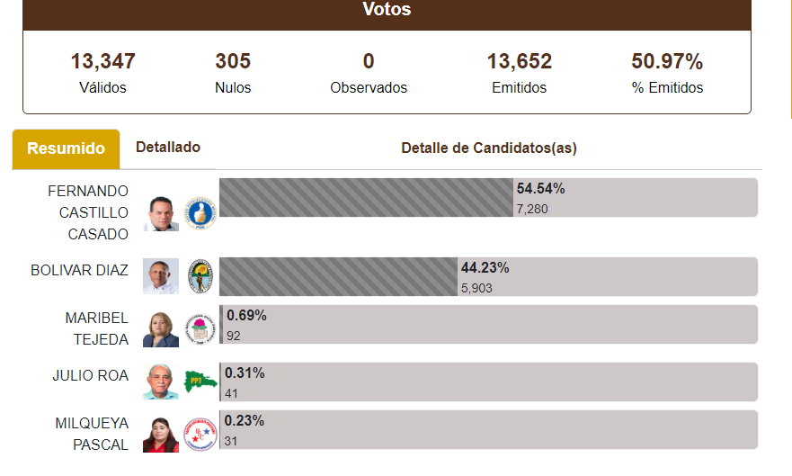 Fernando Castillo Casado, quien pertenece al Partido Revolucionario Moderno (PRM), ganó la contienda de estos comicios municipales en San José de Ocoa con el 54.54% con un total de 7,280 votos, superando a su rival Bolívar Díaz, del Partido de la Liberación Dominicana (PLD) y la alianza Rescate RD, quien obtuvo el 44.23% de los votos, totalizando 5,903 sufragios.