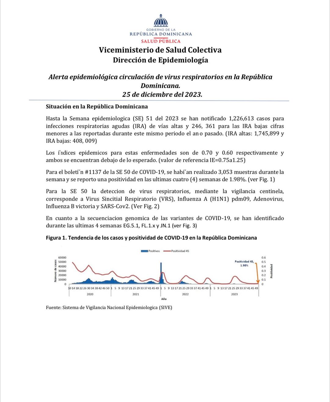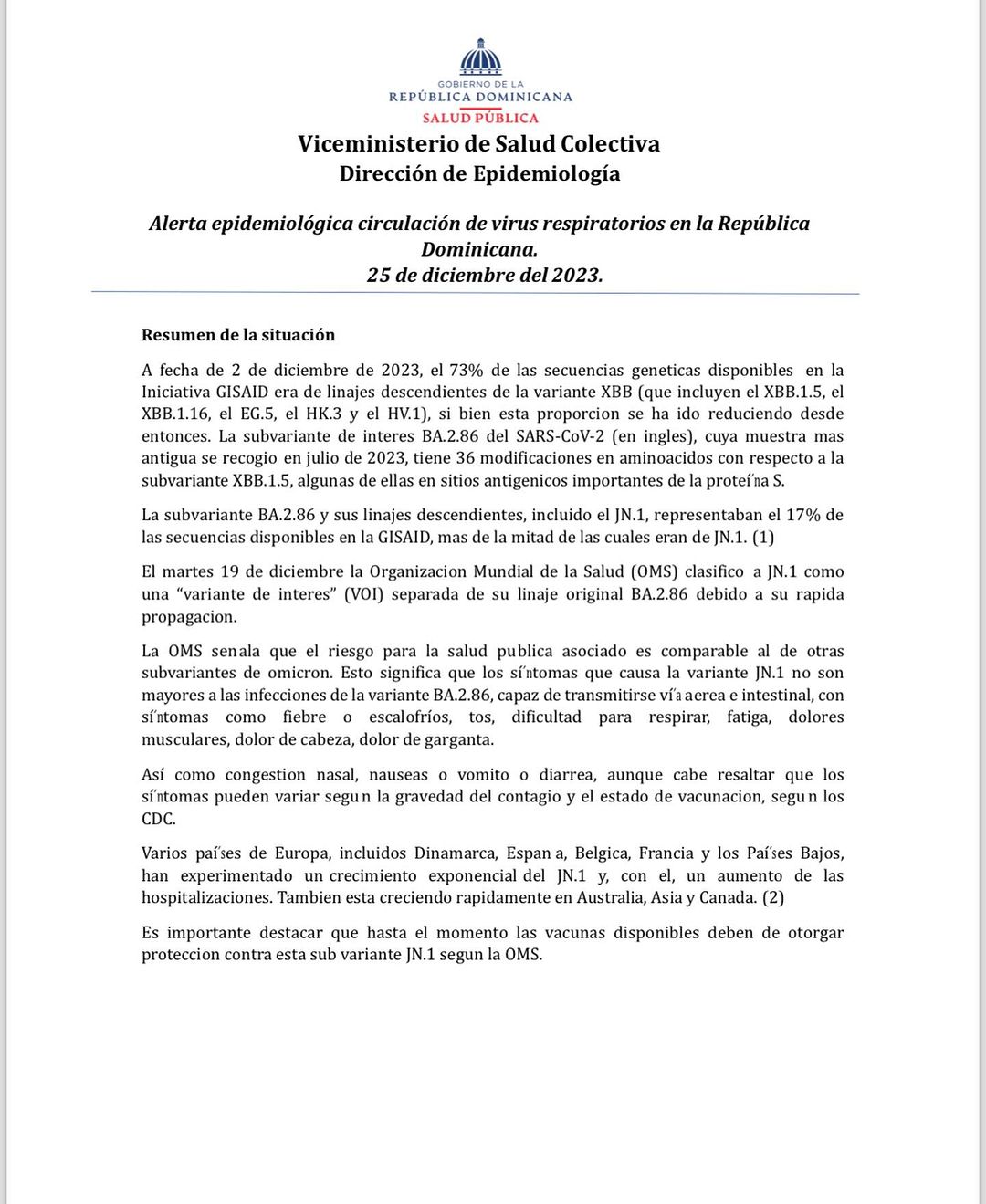Santo Domingo.– SANTO DOMINGO.- El Ministerio de Salud Pública emitió la tarde este lunes 25 de diciembre una alerta epidemiológica por virus respiratorios en territorio de la República Dominicana.