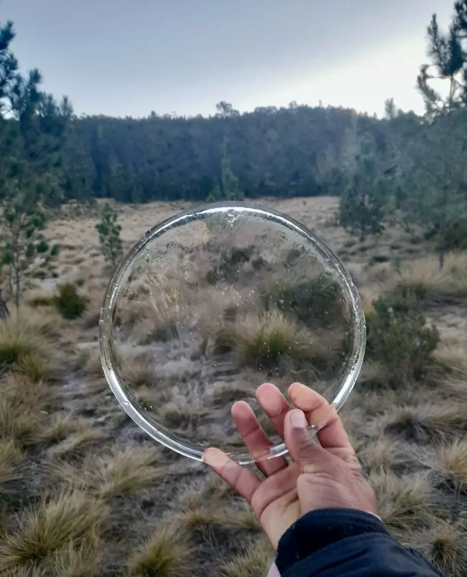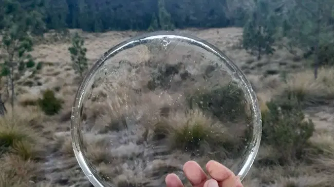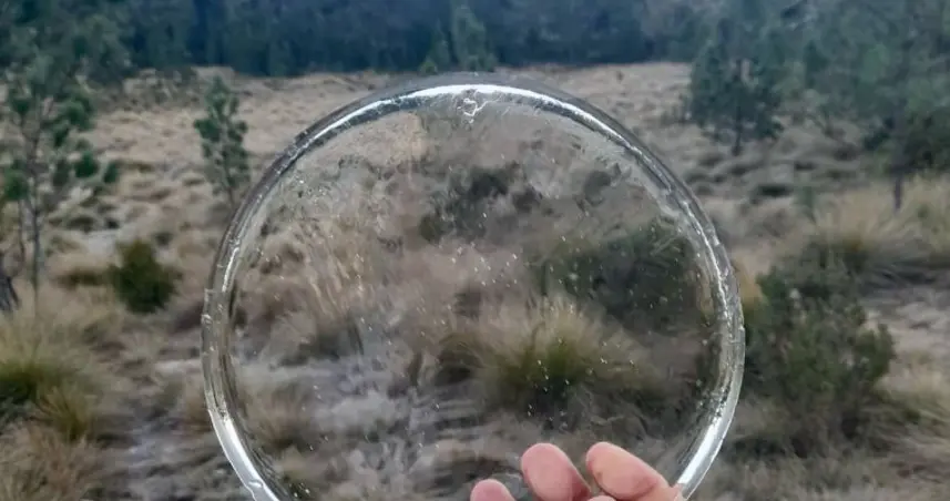 El gélido amanecer produjo el congelamiento de agua dejada en envases a la intemperie, en los alrededores del Centro de Visitantes La Pirámide.